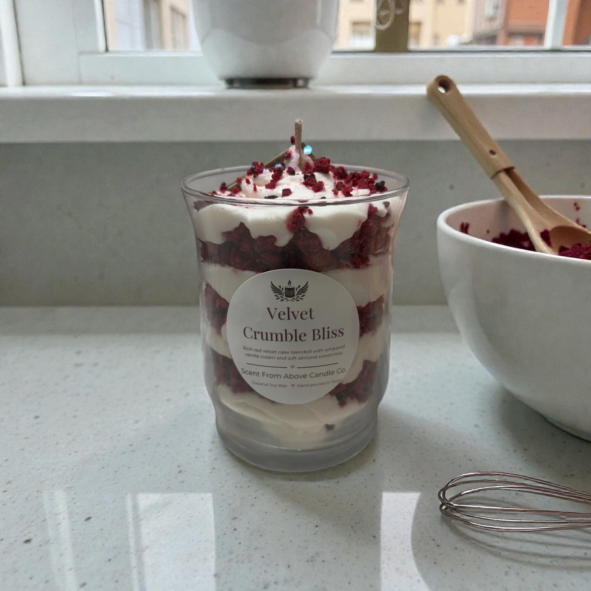 Velvet Crumble Bliss is a decadent dessert candle that fills your space with the irresistible aroma of freshly baked red velvet cake. Deep cocoa notes blend with smooth vanilla cream and a buttery cake crumble, creating a warm, bakery-fresh scent that feels indulgent and comforting.